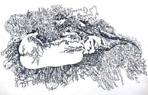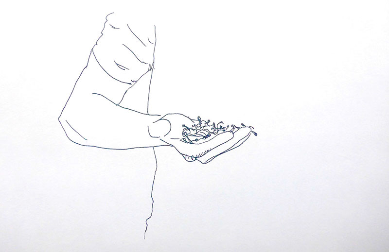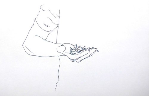 Il y avait parmi eux un enfant taciturne, que l’on pensait muet de naissance qui fut le premier, il ne se lavait pas, à faire pousser dans sa tignasse terreuse un plan de pissenlit dont on put recueillir et mastiquer religieusement les feuilles. S’en suivirent toutes sortes d’expérimentations plus ou moins heureuses, selon les graines emportées et la patience des corps-porteurs. Une jeune femme réussit, en restant allongée plusieurs semaines au bord d’un ruisseau à faire pousser une salade entre ses seins, la tenant précautionneusement à l’abri des regards impudiques, elle aurait transmis le trognon à un homme pour qu’il renouvelle l’expérience, la croissance de la plante ayant trop irrité sa peau pour qu’elle réitère immédiatement l’opération.