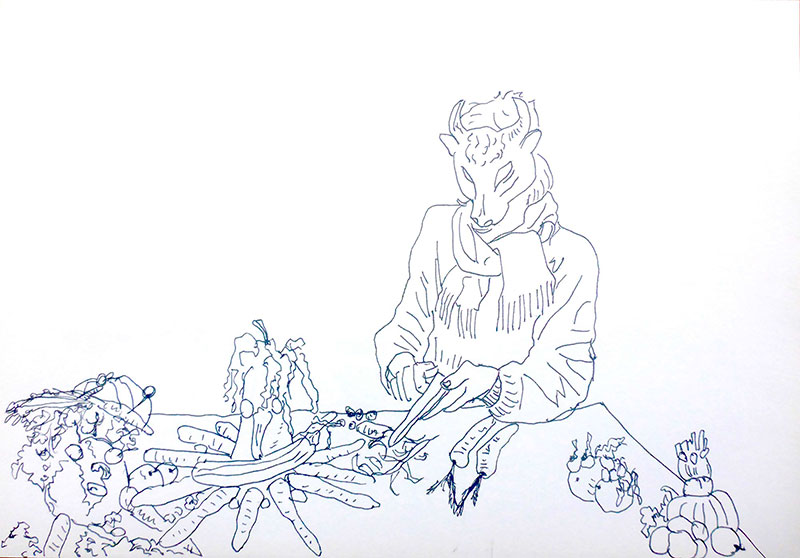 Aujourd’hui tout le monde est pauvre. La pression démographique associée à la disparition du vivant nous ont obligé à nous convertir à l’alimentation aéro-dermique : se nourrir par la peau du soleil et du contact avec quelques végétaux, et réserver le partage de quelques victuailles végétales, graines, légumes et jus, aux rares festins rituels qui marquent le changement des saisons.