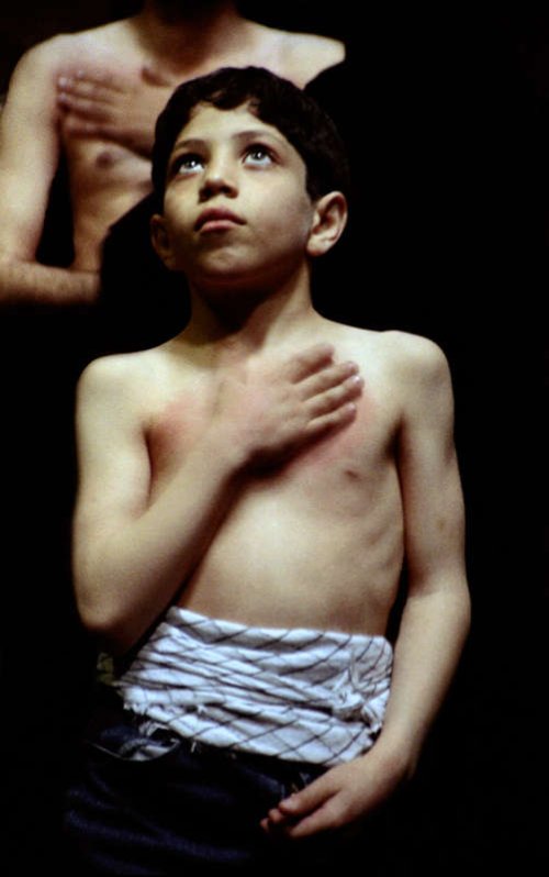 L’exposition achève son voyage en Iran. Les corps mouvementés des photographies d’Arshia Kiani contrastent avec la force murmurante et la fragilité solitaire des slaves : c’est la cérémonie de l’Achoura, commémoration funeste mais aussi jeûne purificateur. Des hommes se martèlent le torse : la chair trouve son sens dans le partage collectif et le collectif dans la douleur. Un enfant, soudain, émerge de la masse, et à nouveau le silence. Quelque chose de contemplatif comme une prière, de corporel comme une élévation, se tisse. Une nouvelle étape commence.