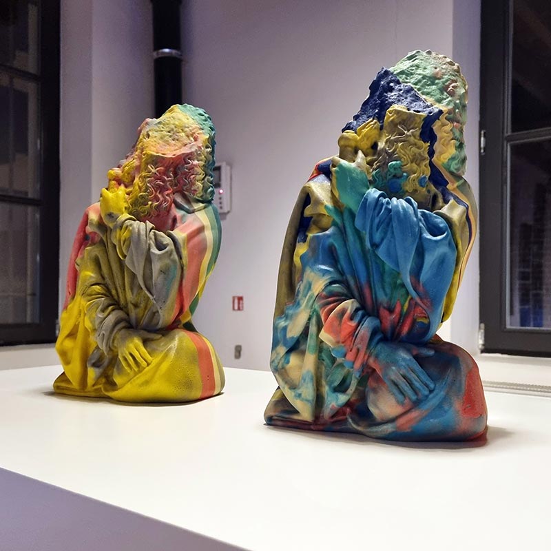 Certains acteurs du monde de l’art ont souvent reproché aux œuvres numériques d’être duplicables à l’infini. Tout en rappelant que nous ne connaissons de la statuaire grecque que les copies romaines, Oliver Laric émet l’hypothèse que les Versions d’une même création n’en perdent pas pour autant toute forme d’aura. Allant même jusqu’à évoquer les mèmes, qui se multiplient sur l’Internet comme autant d’interprétations qui disent notre relation aux images à l’époque de leur extrême reproductibilité. Les sculptures de l’artiste matérialisent sa pensée puisque, si elles sont à la mesure précise d’œuvres originales, elles n’en sont pas moins singulières tant par leurs étranges matériaux que leurs textures ou couleurs.