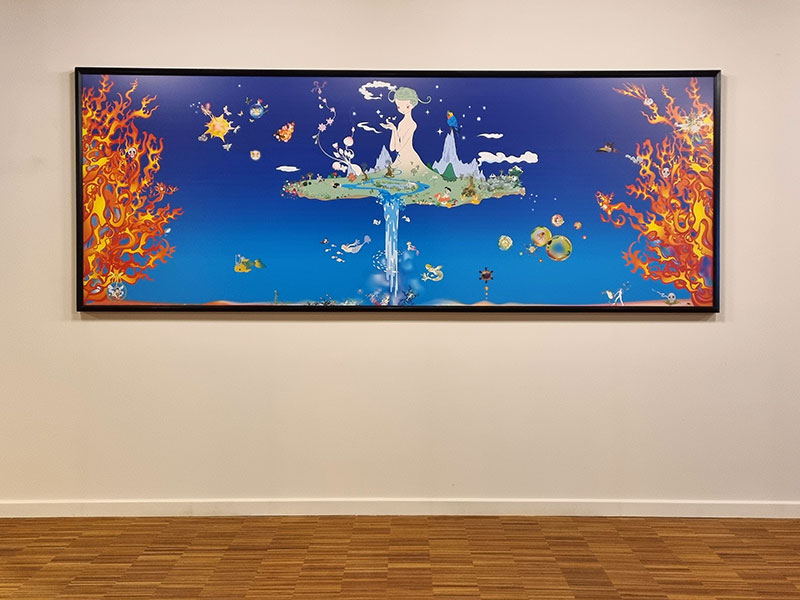 L’esthétique de Chiho Aoshima est aussi faite d’emprunts à la peinture traditionnelle comme aux cultures populaires. Ses univers colorés nous apparaissent tels autant de rêveries sans profondeur aucune. Nos regards glissent littéralement à la surface de Paradise. Quand quelques éléments visuels, en périphérie, toujours nous ramènent au visage de cette jeune femme aux yeux ronds. Un personnage récurrent dans les représentations de l’artiste. Il est intéressant de remarquer que ses outils ou procédés techniques sont semblables à ceux utilisés dans l’industrie graphique. Ce qui, du point de vue du rendu, participe à abolir les frontières entre des pratiques qui seraient plus ou moins artistiques et, par extension, à éradiquer toute idée de hiérarchie des genres.