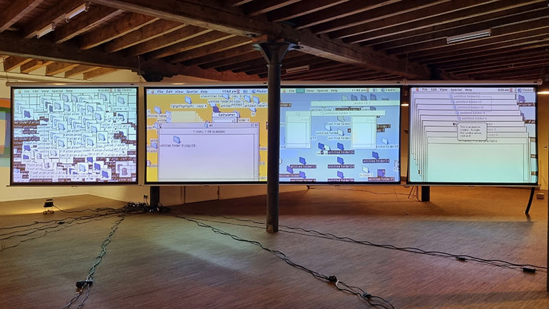 Qui n’a jamais vécu de petites frayeurs avant de s’apercevoir qu’il était trop tard pour annuler une commande allant nécessiter un temps d’exécution inutile ? Ces petites frayeurs, les membre de JODI les coordonnent pendant les performances My%Desktop qu’ils enregistrent, documentant ce que les services informatiques d’entreprises trop bien organisées qualifieraient de mauvaises pratiques. C’est ainsi que les deux artistes tentent de repousser les limites des applications de bureau de leur système d’exploitation – comme avec Mac OS 9 que plus personne n’utilise – et participent à une forme d’archéologie des médias tout en nous livrant ce qui relève de plus en plus de l’intime, c’est-à-dire les bureaux de leurs ordinateurs. Si My%Desktop a d’abord circulé au sein de la communauté numérique de l’art, il n’en est pas moins considéré aujourd’hui tel un chef d’œuvre par le Musée d’Art Moderne de New York qui l’a publié dans la dernière édition de son MoMA Highlights.