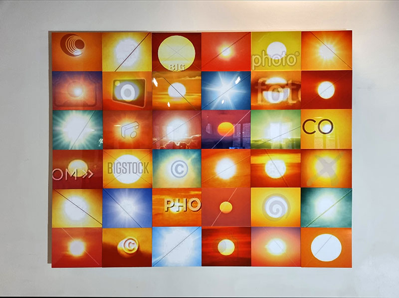 C’est sur des plateforme dédiées à la photographie que Penelope Umbrico opère ses prélèvements. Avec 36 copyrighted Suns/Screengrabs, l’artiste nous confronte à de multiples soleils. Se faisant, elle adopte la posture d’une commissaire d’exposition. Et dans ces images, des détails attirent notre attention. Il s’agit des copyrights incrustés dans l’image, comme une tentative désespérée de protéger juridiquement des couchers de soleils qui, avouons-le, se ressemblent tous. Internet est ainsi fait de contenus que l’on voudrait à la fois partager avec le monde entier tout en les préservant pour soi-même. Quand le soleil, en cette époque de privatisation spatiale, est fort heureusement encore considéré tel un bien commun !