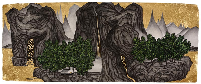 La valeur du spirituel est présente dès le début d’une pensée de la tradition chinoise sur la peinture des montagnes et des eaux. « Concernant le paysage (montagnes-eaux), il y a de la matérialité mais elle tend au spirituel [12] », dit Zong Bing (375-443), l’auteur du premier grand traité de la peinture paysagère chinoise. Cette valeur du spirituel ouvre la voie de la médiation par le paysage afin d’accéder à la sagesse. Au VIe siècle, en des termes plus proches du processus artistique et du jugement critique, Xie He (479-502) instaure comme le premier de ses six principes-canons artistiques, l’animation et le mouvement de la résonance du souffle-énergie [13], concrétisant ainsi la valeur du spirituel. Yao rejette ces principes-canons qui ont dominé l’histoire de la peinture chinoise pendant plus de 1500 ans. Il le fait en changeant d’outil (le stylo au lieu du pinceau), de support (papier au coton indien au lieu du papier traditionnel chinois pour encre-chine), de technique pour le « laissé blanc » (il y met des feuilles d’or) (Fig. 3) [14].