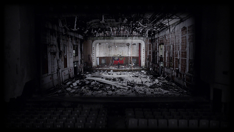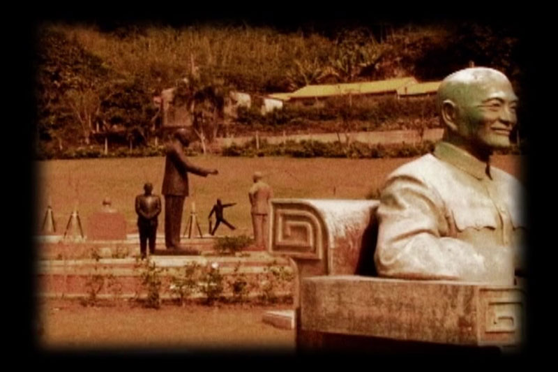 Depuis 2007, Yao a réalisé une série de cinq vidéos où ces fantômes de l’histoire sont personnifiés, suggérant la figure d’un généralissime en uniforme. (Fig. 7) Les sites de ces vidéos sont marqués par l’idée d’une république défunte mais existant et « marchant » encore. On y trouve : le parc, décoré de centaines de statues de Chiang et de son fils déboulonnées de leurs bases habituelles ; le parc des monuments en miniature dans lequel se trouve aussi le palais présidentiel ; la plus haute montagne de Taïwan (la Montagne de Jade) dont le sommet est orné d’une statue d’un ancien grand dignitaire de la République de Chine ; le grand hall de réunion où sont encore accrochés les fameux slogans de Chiang. (Fig. 8) Mais l’ensemble est tombé littéralement en ruine, jusqu’à la prison destinée aux prisonniers politiques dans l’Île Verte, une petite île voisine de la grande île de Taïwan. Tous ces lieux suggèrent une République qui n’a de réalité que le nom, laquelle est hantée par certains fantômes qui ne veulent pas partir. Ces vidéos font partie d’une géographie politique configurée non seulement par la lutte entre les nationalistes et les communistes mais aussi par cette guerre froide qui semble se rallumer.