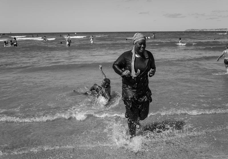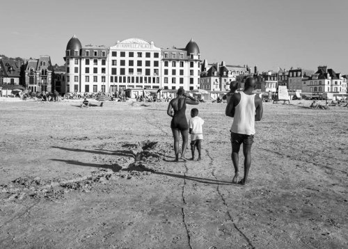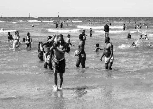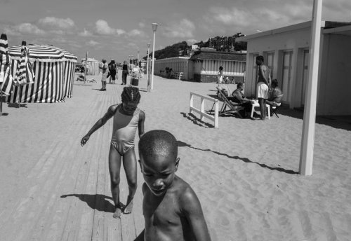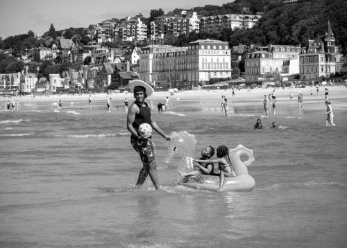 Alain Nahum nous fait partager la joie de la découverte de ces nouveaux espaces, libres et vivants, le plaisir des jeux d’eau, du partage avec la famille, les enfants. Il n’est pas un photographe humaniste, c’est un photographe humain. Sans voyeurisme, il montre subtilement l’intime et le désordre du monde. Sur les plages bien policées de Deauville, ces photos donnent l’impression d’un autre continent. Sur place, il s’est vu reproché de photographier ces baigneurs·euses, majoritairement noirs·es, pourtant il faut rendre compte de cette ségrégation cachée, et être capable de photographier le plaisir et la joie.