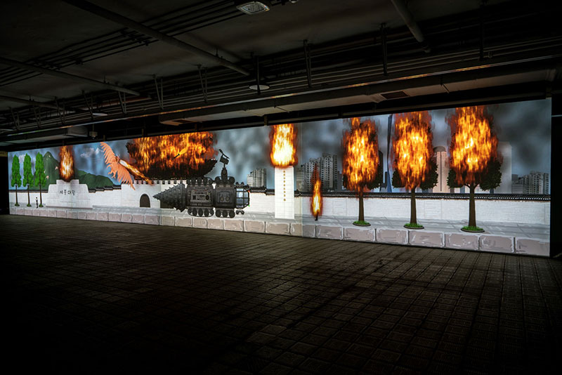 At the Seoul Museum of Art Bunker in Seoul, Choi presented the finalized trilogy of Operation Mole-Final Stand series, a multi-channel immersive video installation. The title borrows from a popular video game, which is a first-person shooter video game of military actions of historical and modern warfare. Unlike the video game, Choi’s work presents a series of 2-D animations, using Adobe After Effect. At the beginning of the latest version of the animation series, a robot and a tank with a massive drill in the front are being constructed in a dark factory. Then, a solider appears. It seems he is operating the tank, drilling underground. Then the screen invites us a vast field of view of a military camp with lots of events happening at the same time in different locations such as manufacturing the robot, drilling the ground, a drone flying, etc. From the ground, a strange-looking creature comes out, and the army tower starts to attack the beast. The beast gets angry and fights back. It destroys the army base. A nuclear bomb is dropped, and everything is gone except the beast. The beast moves and continues to destroy things around him. Then the beast metamorphoses itself into a mystical creature that looks like a phoenix. Seoul is being torn apart by fire coming out of the mouth of the phoenix, while people in the street seem to be undisturbed. The tank shown in the beginning follows the phoenix and kills it. The video ends.