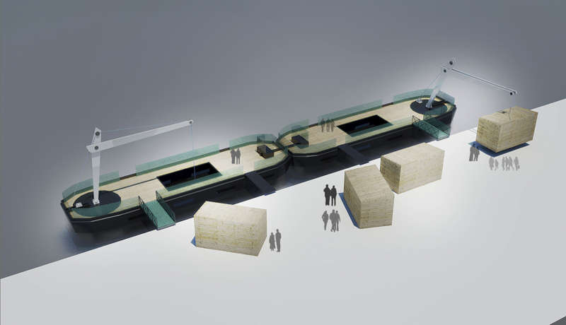 Les barges qui naviguent sur la Seine sont l’évolution industrielle du transport fluvial. Elles ne remplacent pas encore les péniches qui elles aussi ont changé de format. Caissons flottants sans motorisation, elles transportent de lourdes charges au gré des frets. Sans attache, souvent sans nom, elles sont déplacées par un pousseur pour rejoindre leurs lieux d’accotement. Leur trajectoire anonyme dans les territoires qu’elles traversent tissent des liens invisibles entre les multiples acteurs du fleuve et de ses berges. A l’image d’un curseur se déplaçant dans le contenu de l’histoire, leur déplacement se limitent au tirant d’eau nécessaire sur la longueur navigable de la Seine et de ses affluents.