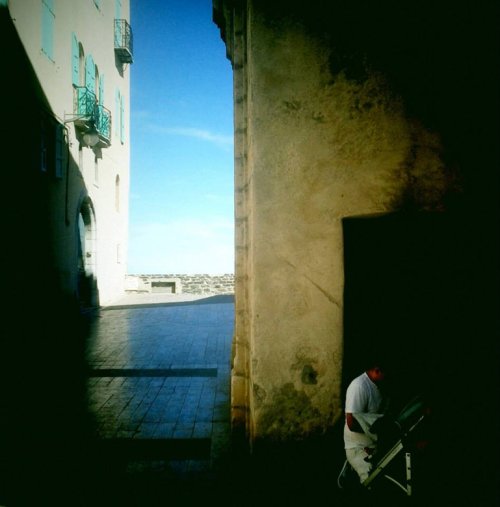 "Seul le bruit de la mer contre la roche vient perturber cette quiétude. Je suis assise sur ce banc patiné par l’air salé. Il m’offre une vision de dégradé de couleur. Le ciel bleu azur fait écho aux volets pales de la grande maison. Au fond le port offre aux bateaux un peu de répit à l’abri des vents et marées. Le sol pavé brille. Ce sont des ruelles où l’on imagine aisément le déroulé d’un roman. Comme si le temps s’était arrêté-suspendue entre cet ici et cet ailleurs- mon esprit vague vers une autre histoire que la mienne. Tout à coup une silhouette blanche se détache de l’ombre. Il traverse ce tableau presque irréel. C’est le héros qui s’engouffre dans mon récit. Que fuit-il ? Quelle est son intention ? Quelle intrigue puis-je -écrire ? Je n’ai peut-être pas envie d’imaginer la suite car finalement n’est-ce pas mon errance que je trace par ces mots ?"