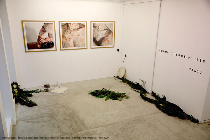 Voilà que nous tournons à gauche, dans un renfoncement de la galerie. On y voit des dessins et des photos de la performance Germinations (Rio de Janeiro), où Pascale a fait pousser des graines dans des petits pansements, directement dans le terreau de sa peau. Chaque graine a son emplacement précis sur un organe de l’artiste (utérus, seins, estomac, ovaires, foie…) : le corps et la nature ne font plus qu’un et la peau est le lieu de la renaissance. Puis on voit des dessins des performances collectives réalisées à la Cité Internationale de Paris, où les artistes étaient par paires : l’un était blessé, soigné par l’autre, avec une plante particulière. Les vertus prophylactiques des plantes sont convoquées par de nombreuses performances d’Hantu, rappelant à nouveau cette idée du soin par l’art. Par exemple, saviez-vous que le lin est une graine emblématique pour la femme, une graine de stabilisation, utilisée sous forme macérée pour soulager les symptômes de la ménopause ?