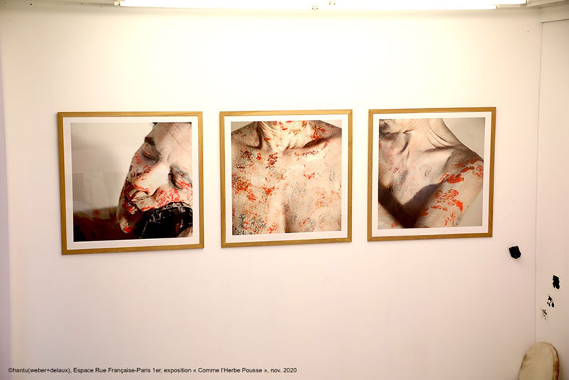En franchissant le seuil de l’Espace Française, l’œil est tout de suite attiré par ces cadavres végétaux étendus au sol. Ce sont des lits de germination en plâtre moulés sur le corps de Pascale Weber et garnis de végétaux, de terre, de matière organique. L’image évoque le corps mort qui, dans sa thanatomorphose, ne fait plus qu’un avec sa Terre-Mère et devient lui-même un amas de végétaux, un terreau fertile pour de nouvelles naissances. C’est un fort symbole d’espoir, de renouveau, un oxymore élémentaire. Ces lits font directement référence à une pratique funéraire en Égypte Ancienne, découverte par Hantu lors de la Biennale du Caire : ces lits se trouvaient dans les tombeaux et étaient régulièrement sortis pour rappeler aux vivants que la vie continue après la mort. C’est également ici qu’a eu lieu la performance de Simona Polvani, pour le film « Nature Vive » : à côté du gisant végétal de gauche, elle a pansé des restes de compost sur le sol. Le geste, pensé comme un rituel, semble incarner l’humain qui tente de guérir la Terre, de la nettoyer, de la soigner, comme une sorte de repentance. A ce sujet, Pascale Weber parle de traces de performance : « En fait, un objet-trace, intervient comme un commentaire, un objet-trace c’est un commentaire matériel [3]. » Ces traces sont la mémoire vive de ce rituel et portent en elles les résidus de son efficacité symbolique. La notion de soigner, de panser, de guérir est très présente dans l’art d’Hantu. Comme en écho à la notion même de « fracture sociale », que l’artiste devrait soigner, Hantu rappelle que « l’artiste est celui qui en permanence laisse la plaie ouverte, et l’entretient, pour montrer que le mal est là, qu’il est vain de le cacher, que la cicatrisation est impossible tant qu’on ne soigne pas la cause de la douleur à l’intérieur. Donc le pansement ne cache pas la plaie, le pansement est révélateur de la plaie [4]. »