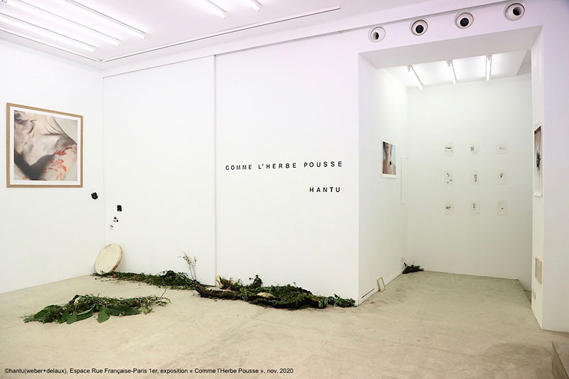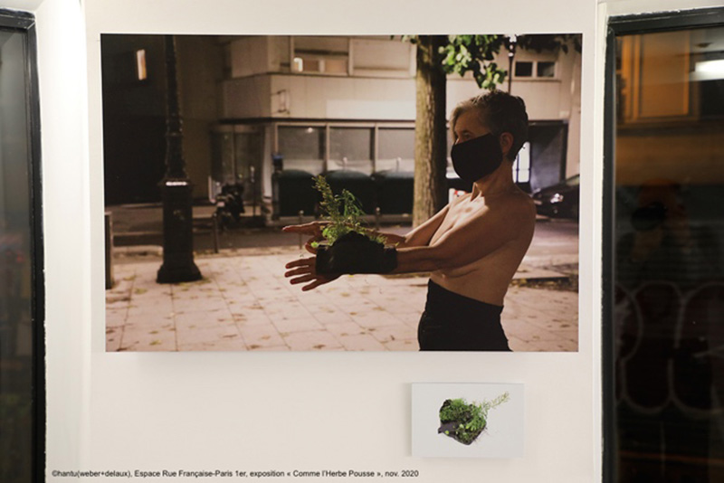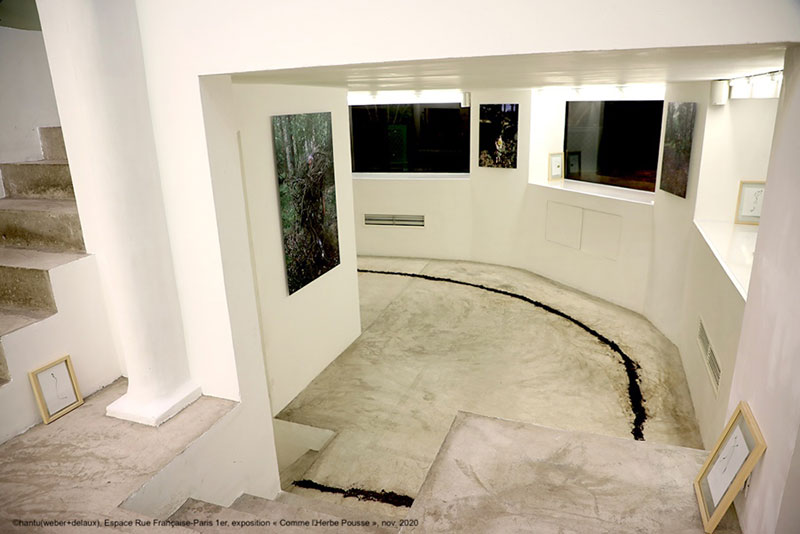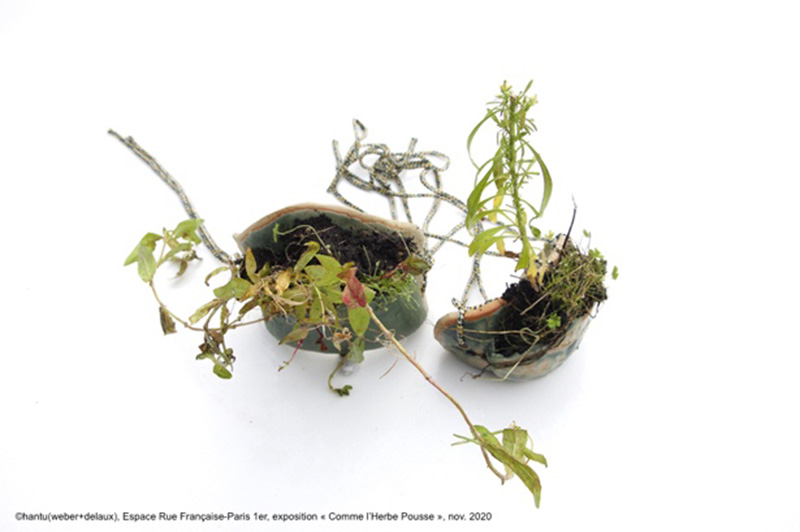 Je réalise le privilège que cela représente, dans un monde du Pendant (quand arrivera l’après ?) où la culture pleure sur ses œuvres négligées. Après avoir traversé à vélo un Paris désert et endeuillé, j’arrive à l’Espace Rue Française, où je suis accueillie par Pascale Weber, du duo Hantu (Weber+Delsaux). L’exposition Comme l’herbe pousse présentée par le duo de performeurs en plein Paris est une invitation à retourner à la terre, au sol, aux plantes, aux brins d’herbes : « Quitter la pensée-arbre avec ses hauts et ses bas, ses alphas et ses omégas, devenez un penseur-brin d’herbe, qui pousse et pense ! » —, s’exclame Gilles Deleuze. L’exposition nous appelle à devenir des penseurs-brins d’herbes au sein d’un monde urbanisé coupé de la nature et de ses enseignements. C’est ainsi que dans un espace typique du white cube [1] sont disposés çà et là des plantes, des restes de compost, des matériaux organiques et périssables, des matériaux vivants, créant un véritable jardin de réflexions. Le parti pris scénographique est des plus épurés, sans aucun cartel ou texte de salle : les œuvres semblent ainsi libérées de leur carcan institutionnel traditionnellement lié au lieu d’exposition.
