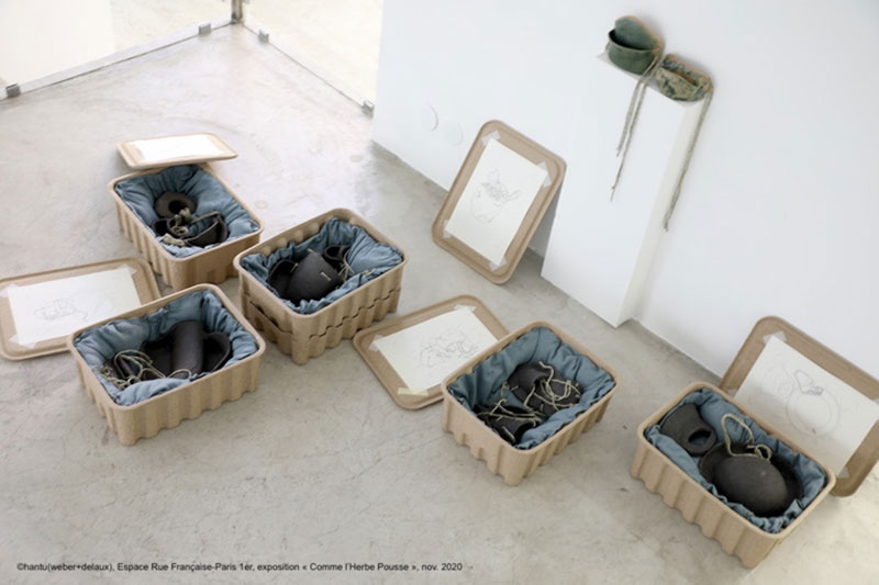 Après s’être extirpé de sous terre, on emprunte une volée de marches pour arriver au premier niveau. Mon regard se porte sur une installation dont la scénographie rappelle celle d’une fouille archéologique. Des terres chamottées [11] de formes diverses sont présentées dans des boîtes tapissées de tissu, accompagnées de dessins précis. Certaines sont habitées de plantes. Aucune explication ou titre n’est donné : il s’agit d’une mise en scène, d’un support à fictions, d’une incitation à imaginer. Certains ont la forme de masques, symbole emblématique de la pandémie mondiale actuelle. Hantu a utilisé ces objets-rituels durant le premier confinement pour réaliser la série de photos performatives « Comme l’herbe pousse », où l’on voit Pascale, torse nu, portant ces objets. Les photos ont été prises la nuit, dans le quartier très animé de Stalingrad, où se côtoient familles bobos et populations très pauvres, frappées de plein fouet par le confinement. Stalingrad est une plaque-tournante du trafic de crack dans la capitale. L’artiste raconte avoir ressenti une certaine peur face aux populations qui peuplent ces rues la nuit. Mais Hantu voulait ressentir et donner à voir ce sentiment d’insécurité qui nous habite et aime cette idée de braver les interdits pour continuer à vivre.