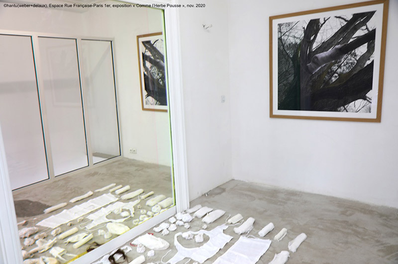 Au dernier niveau de l’exposition se profile la cime des arbres. Nous voilà dans un nid haut perché, relié au premier niveau par un escalier. Et sur le mur la photo d’un arbre, habité d’une sorte de cocon. J’apprends que c’est Pascale, accrochée à cette branche, pansée de grandes bandelettes de lin et de coton qu’elle réalise elle-même et dont son partenaire Jean Delsaux l’enveloppe. Le titre de la performance prend alors tout son sens : Corps & Arbres, réalisée maintes fois par Hantu. Ce rituel est en résonnance directe des rituels indonésiens (Sulawesi) : lors de la mort d’un enfant, son corps est déposé dans le trou d’un arbre et pansé de bandelettes. L’arbre referme lui-même cette plaie, avec l’enfant à l’intérieur. Pascale parle d’une performance cathartique, comme d’un nettoyage total, qui lui permet de panser ses plaies. Au sol est disposée une installation de différents objets rituels en tissu (lin et coton), utilisés régulièrement dans différentes performances du duo. Ils portent la trace de la terre, de fleurs, d’insectes, de leurs usages. A nouveau, la scénographie se présente comme une fouille archéologique, voire comme un dispositif médical. Certains sont des masques, réalisés pendant le confinement : un a la forme d’une vulve destinée à accueillir des plantes, d’autres ont forme de seins ou de ceinture abdominale à poches pour accueillir des graines.