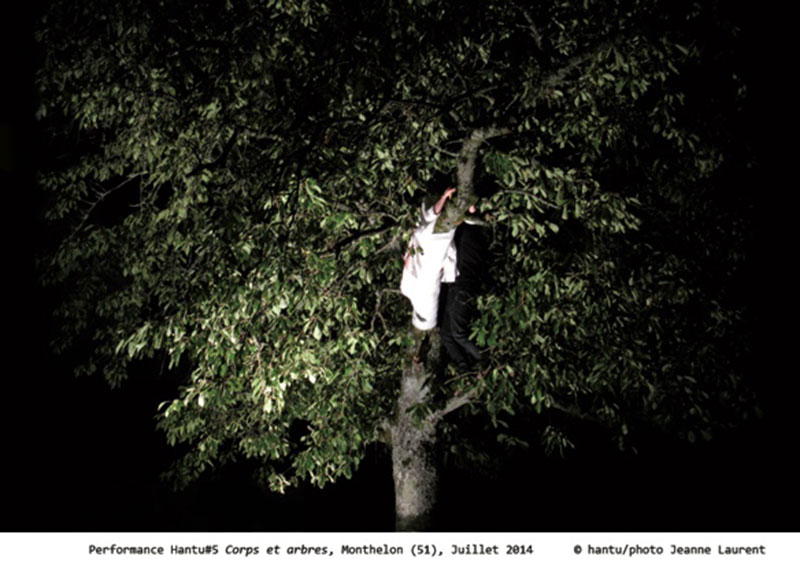 Magnétiquement, je suis attirée par ce niveau sous terre, dont les fenêtres sont à la surface du sol. Le mystérieux arc-de-cercle de terre semble venir des escaliers, descendant à une cave. C’est une autre trace de performance, réalisée pour « Nature Vive » par Michiko Fou. Son arc matérialise un rite de protection, pratiqué en Russie (entre autres) lors des épidémies pour protéger la ferme, la maison, le village. L’arc incarne la puissance du symbolique, de l’efficacité du rituel, de la force essentielle du matériau terre. On y ressent toute l’énergie protectrice de la nature. L’espace ainsi protégé est un écrin pour des photographies performées ainsi que des performances photographiées. Les premières sont des œuvres d’art indépendantes, les secondes constituent les traces, la mémoire, le souvenir de la performance. Le corps de Pascale y est tantôt vêtu de branches, de vêtements végétaux, de racines, d’argile (Mandragore)… Ou encore habité d’insectes morts, que Pascale récolte systématiquement et conserve précieusement. Au sein même de la galerie, on peut voir ici et là des cadavres d’insectes. Une fusion s’opère à nouveau, entre terre, nature, vivant, végétal et humain, qui n’est plus une espèce à part, mais bien un animal prenant conscience de son écosystème. A nouveau, des bribes de lectures me reviennent à l’esprit. Je pense à Do Kamo. La personne et le mythe dans le monde mélanésien de Leenhardt, où l’on apprend que les communautés mélanésiennes considèrent le corps humain au même titre que toutes les autres composantes du cosmos et de la nature environnante, créant ainsi un tissu symbolique indestructible entre les corps et le monde extérieur. Le corps est la substance même de l’univers. Ainsi l’humain bon, beau, est appelé « do Kamo », c’est-à-dire humain vrai, authentique. C’est au cours des processus de colonisation que les européens ont apporté avec eux le concept nouveau de l’individu. « Ce que vous nous avez apporté, c’est le corps [9] », dit un vieil homme Canaque cité dans Do Kamo. Le corps devient un facteur d’individuation, et dans cette conception individualiste, il permet de s’extraire du tissu symbolique cosmique. Il devient, non plus l’essence de l’homme, mais son attribut, c’est une véritable « rupture ontologique entre le cosmos et le corps [10] ». Peut-être les performances et leurs traces d’Hantu tentent-elles de rappeler le « do Kamo » qui est en nous ?