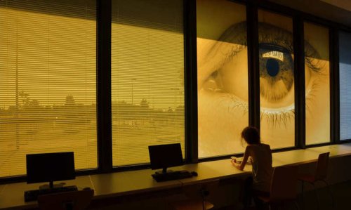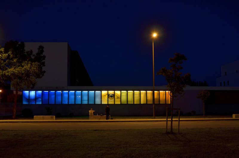 La face architecturale devient avec les films photographiques interface entre l’espace intérieur et extérieur. Un œil fermé, un œil ouvert, liés par un dégradé de couleurs, se déploient sur toute la longueur de la façade vitrée. La lumière du jour illumine les images de l’extérieur vers l’intérieur du CDI, la nuit, le dispositif de lumières artificielles éclaire les images de l’intérieur vers l’extérieur, à l’instar d’un caisson lumineux.