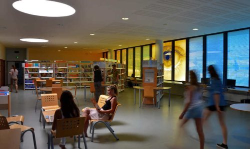 Le centre de la documentation et de l’information (CDI) est un environnement de savoir, de connaissance et d’éducation. En réponse à ce lieu d’apprentissage et d’ouverture sur le monde, orienté par l’architecte vers l’extérieur, nous proposons une extension du regard. Exposée au regard extérieur, renvoyée au regard intérieur, à sa propre intériorité. Durant la journée, la lumière du jour extérieure fait vivre les images vers l’intérieur ; du coucher du soleil jusqu’au début de la nuit, un dispositif de lumière artificielle à l’intérieur illumine les images vers l’extérieur, comme une boîte lumineuse à l’échelle du site. La surface vibre. Le bâtiment ne s’efface pas dans la nuit, mais reste visible, animé.