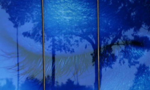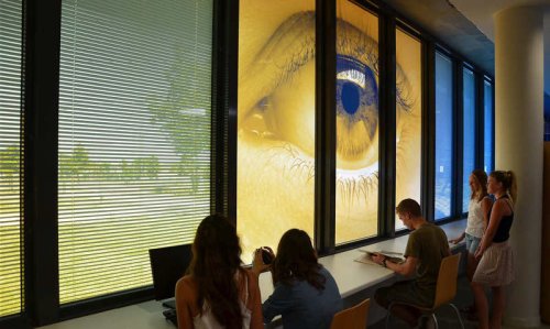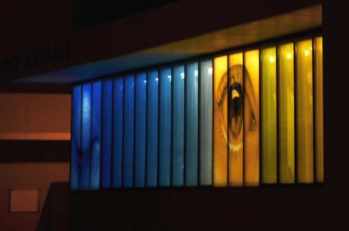 La première intervention dans l’espace réel se situe sur la façade vitrée, elle consiste à créer une interface entre l’espace intérieur de l’école et l’espace extérieur public. Les films photographiques colorés sont positionnés sur l’ensemble des vitrages : un œil fermé et un œil ouvert occupent respectivement de part et d’autre trois vitres, un dégradé de couleurs prolonge et lie les deux images. La membrane colorée se déploie sur toute la longueur créant un rythme, une notion de mouvement abstrait, dynamique. La surface vit.