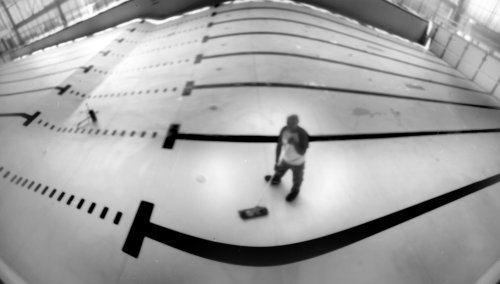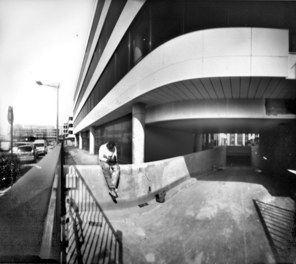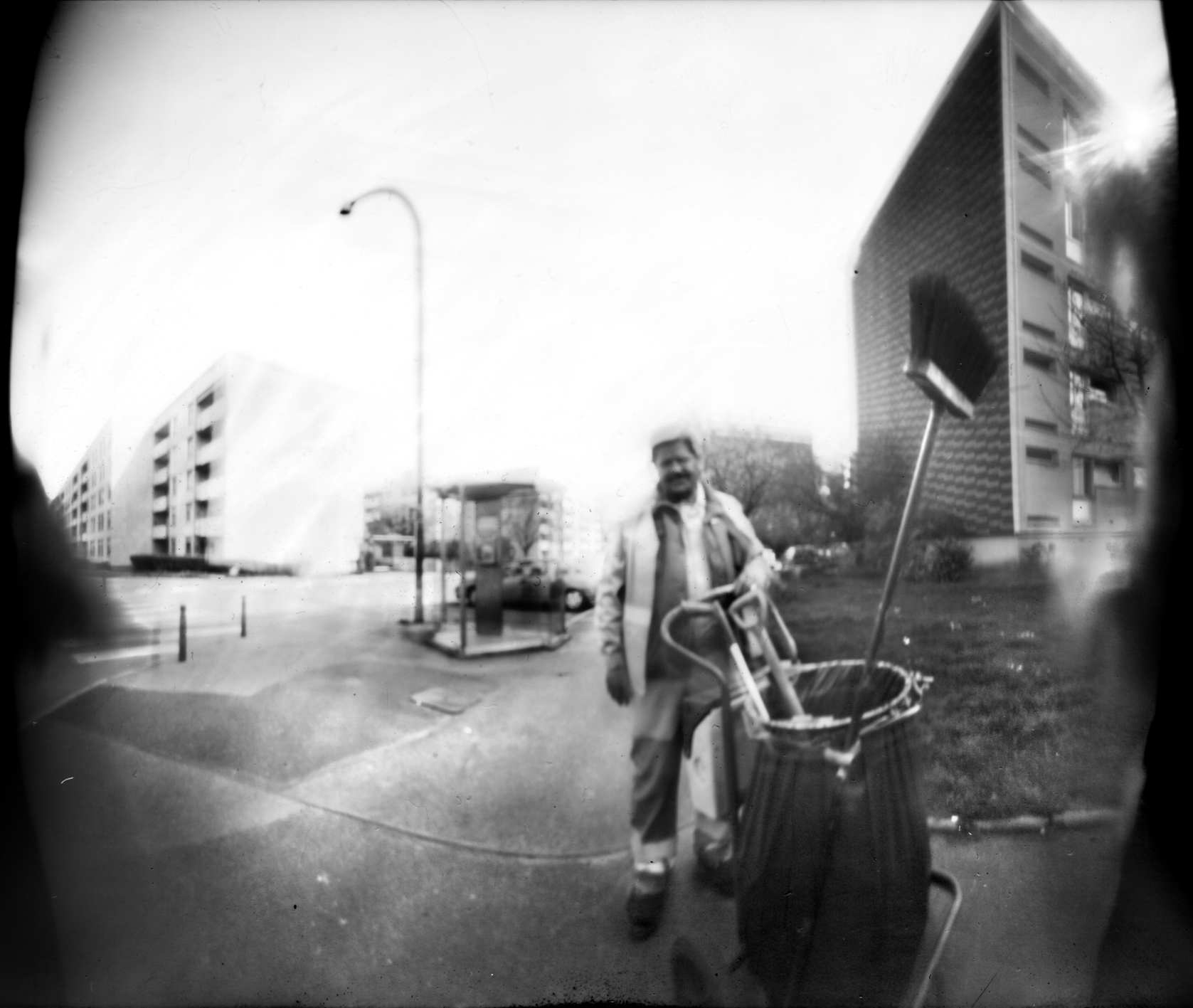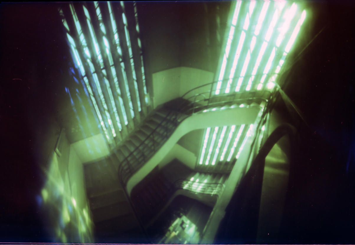 Les images réalisées par Judith Baudinet avec un sténopé, nous donnent à voir, non seulement l’un ou l’autre de ces fragments de réalité qui hantent les images photographiques comme des spectres, — caddies de supermarché, escalier, paysage, corps vu en contre plongée —, mais surtout un étrange halo.