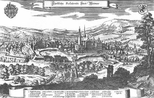 Là le château déploie son allée dallée et son pont d’arches perdu dans le parc et les touffes des arbres, et l’accès de la ville depuis Iena et Dresde se faisait ainsi par le château et le parc, la cité prolongeant alors le château et le parc comme d’abriter des demeures cachées derrière les jardins, magnifiées de leur entrée, et conduisant naturellement jusqu’aux limites de la ville, de l’autre côté, à l’ouest, jusqu’au vieux Théâtre de Weimar. C’est alors la route d’Erfurt qui commence, et celle d’Eisenach, petite et jolie forteresse naturelle de montagne, cité de la jeunesse de Bach et aussi des derniers jours de Luther. Quant à l’accès depuis Berlin et Leipzig, il créait au nord une petite percée et débouchait directement sur les petites ruelles de la vieille cité, aujourd’hui le Graben et la Herderplatz, et ainsi pour finir conduisait encore au vieux Théâtre où Goethe fit résonner les premiers mots de son Faust sur la scène.