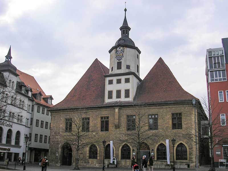 Il y a une sorte de nimbe des mythes dans les mots, entre l’écriture parfois, l’image qu’ils font dans notre esprit et leur sonorité. À Iéna, le nom de la cité en français se dissout dans l’orthographe allemande qui en ferait un adouci Jena, avec l’hésitation un instant de lire un gé pour la première syllabe, enlevant à tout un passé sa sorte de nerf et de batailles supposées, les couleurs d’une histoire, les uniformes militaires, puis retrouvés brusquement dans l’évidence du yé corrigé par l’esprit et prononcé enfin, repris, dans un lointain yod oublié en tête de Jena. Et Iéna ne joint pour moi que par là l’évocation de la Place de Iéna à Paris, le pont, l’avenue près du Trocadéro, l’impression et l’histoire de ces guerres dites napoléoniennes, avec leurs pans de jouets d’enfants grandis, à la fois désuets et claquants, comme l’effort et l’étrangeté de deux armées affrontées puis changées en des soldats peints dans leur destin advenu d’un conte de Grimm ou d’Andersen, les plans à l’encre noire délavée, les reconstitutions, les plaines, les vallons et les uniformes. Et si je n’ai pu ignorer les panneaux, les images, les dépliants signalant ces batailles autour de Iéna ni le scintillement des noms de la Prusse et de Napoléon, nulle matière pour eux ni aucune substance ne flottent en réalité pour nous dans les interstices de l’air à Iéna, entre la vieille université, la maison de Fichte, la Marktplatz médiévale, l’ancien Rathaus ni, plus loin, la vieille église Saint-Michel.