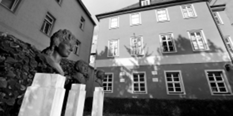 C’est un petit édifice d’un vert pâle préservé. Jusqu’aux géraniums en fleurs en cette saison sur les marches de chaque côté de la porte rouge à deux battants de l’entrée, il offre la dimension accueillante et domestique d’un petit immeuble d’un étage, et qui aurait été augmenté d’un niveau et d’un étage plus étroit aux jolies fenêtres alignées. Un peu plus petite certes, mais comme dans une même mesure de leur réputation et de leurs « émoluments » de professeurs et d’écrivains, sans voisinage aucun avec les grandes demeures « italiennes » de Goethe, la maison de Fichte, à Iéna, fait un étrange écho à la maison de Schiller à Weimar.