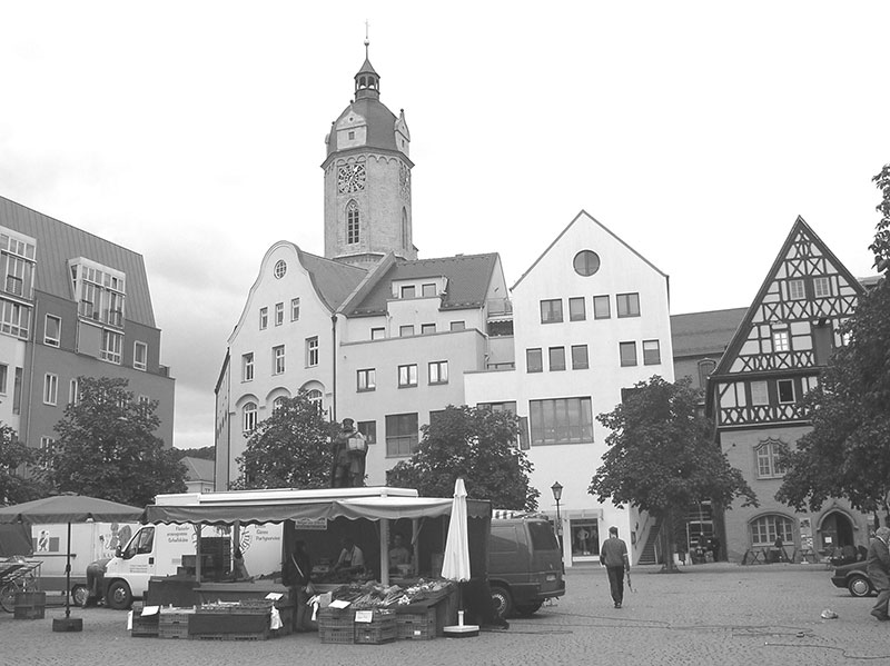 Passée, en haut, la silhouette de ruine préservée de la petite poudrière médiévale des anciens remparts, la Pulverturm, avec son air et ses créneaux effondrés de maquette et de château fort miniature, à un détour des ruelles revenant dans la Kollengiengasse, se présente le diptyque involontaire de la ville et du temps. S’offrent brusquement au regard l’évidence et l’étrangeté de la cité de Iéna. Les années ont forgé ces deux étranges moitiés juxtaposées d’un impossible et géant sablier. Sur notre côté, à gauche, se dresse dans son jet soviétique des années 1970 la Jentower, haute tourelle de verre et de métal luisant, avec à sa base une galerie marchande, et arborant dans son élan vers le ciel une sorte aussi de fin liseré, d’abord imperceptible, puis montant en oblique à l’instar d’une moderne, rêvée et laborieuse tour de Pise de métal et de verre. N’exhibant cependant nulle arête franche, semblant plutôt se refermer sur elle-même en quelque tension interne d’ombilic retenu, et brisant, dans les courbes de son cercle rêvant, dans sa lumière réfléchie et bleutée, les angles des rues tout autour (jusqu’à l’écho et l’image d’autres tours dans notre esprit, la tristesse pesante et un peu funéraire d’une tour Montparnasse à Paris ou d’une tour Bretagne à Nantes), la Jentower miroite aussi dans Iéna comme un bloc solidifié de simple pacotille, signant un étrange et tardif « soviétisme neuf », s’alignant sur d’involontaires et internationaux Sofitel ou Ibis, récents, et aux façades d’un instant.