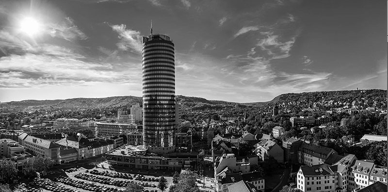 Des collines douces enserrent la cité de Iéna, font de la ville entière un lent étagement, la bordent du vert et du lointain des arbres, tout autant que l’hiver les vallons enneigés en ouatent les pourtours sur les cartes postales et sur les dépliants touristiques de Thuringe, où trône, improbable et arrondie comme un reflet de minéral et d’acier, la tour moderne et bleutée de Jentower.