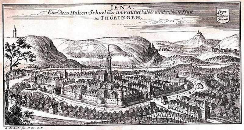 Nous gravissons dans Iéna les pentes et les coteaux de la ville qui donnent l’impression et le repère d’un centre dans leur croisement, d’une vaste place stable de la ville en bas, vers le Rathaus et la rivière jusqu’au jardin Paradies.