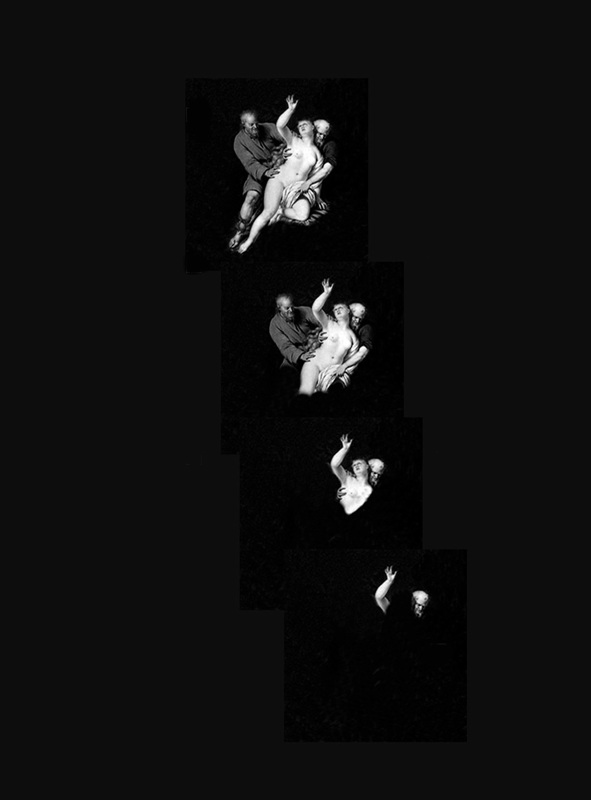 La Video installation de Douglas Gordon, 24 Hour Psycho (1993), présentée initialement à Oxford, une projection extrêmement ralentie de Psycho, met en évidence le mécanisme hitchcockien : le film étant étiré sur une journée, la lenteur hypnotique permet de disséquer la moindre attitude, de démonter le mécanisme de la tension, de la violence et de la terreur. Aimé Agnel évoque dans un essai « le temps très lent, quasi méticuleux, de ce film, par le seul jeu des images et du son [3]. » La saisie numérique du parcours fébrile de la main de Bates avant de s’emparer de la clé fatidique du piège à voyageuses(28’42 à 49, visuel 9) ou la captation de la Suzanne de Mieris progressivement engloutie par l’ombre de Norman, délivrant un noir profond qui annonce l’ensevelissement, relèvent d’une même intention (44’01 à 02, visuel 14, séquence subliminale )