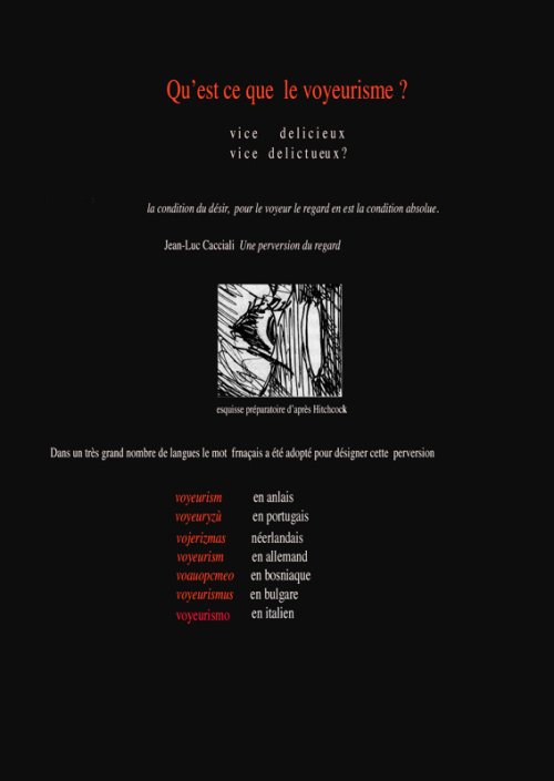 En présentant ce travail de création visuel et graphique, il s’agit à partir de cette séquence de vingt minutes extraite du film de Hitchcock de donner en écho aux nombreux textes qui commentent et le film et la création hitchcockienne et sans lesquels je n’aurais pu réaliser ce travail, de mettre les récits en images.
