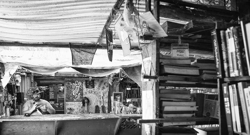 Photos 8 à 13 : Bibliothèque de Slab City. « Je suis né à Boston et je suis arrivé là il y a huit mois pour aider un ami. Je ne sais pas où j’irai après. On verra ». « Mais ici, je ne suis pas stressé. Je suis loin de ce bullshit mainstream, si tu vois ce que je veux dire » – Puma. 40 ans.
