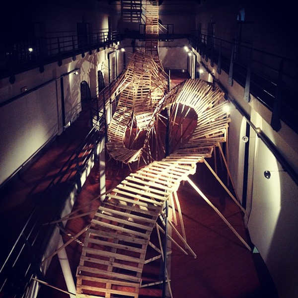 Construit à partir de palettes, ce serpent de bois ressemble à un pont sur lequel il est impossible de marcher, à un chemin qu’on ne peut emprunter, à la langue d’un monstre invisible, à un grand huit qui aurait été secoué par un dieu colérique et burlesque, à une forme pure qui aurait renoncé à la perfection pour révéler l’absurdité manifeste de toute tentative de donner un sens à l’existence, puisqu’en tant que telle cette forme incarne précisément l’existence.