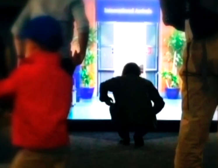 Beaucoup de gens passent et bougent et tous semblent ignorer ce qui est censé faire oeuvre, le très grand écran posé au sol sur lequel on voit quelqu’un passer une porte. Il nous fait face et s’avance vers nous en poussant un charriot. Va-t-il entrer dans la pièce ? Évidemment non ! C’est une image. Et avec un peu d’attention on remarque que la scène se passe dans un lieu qui pourrait être une salle d’arrivée d’un aéroport.