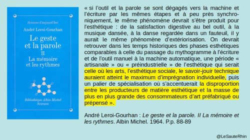 La modernité est l’industrialisation de toute chose. A la division classique du travail se surajoute la séparation producteurs-consommateurs par l’industrialisation de la vie quotidienne. Cette séparation existe, en matière esthétique aussi, comme le signalait déjà André Leroi-Gourhan.