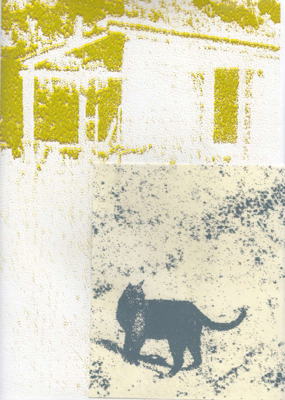 À la lisière du bois, dans le pré où les deux vaches broutent, la cabane en rondins de bois. Le chat noir traverse le pré.