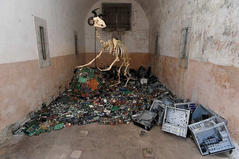 MLJ : Après, le Camelus Post-humanus dans la poudrière, questionne la nécessité de poursuivre la collection au-delà de son point d’arrêt dans les années 70, à la mort de Margalide Bondidier. Tout en demandant ostensiblement si nous n’avons pas perdu de vue la question de l’histoire et de la perpétuation, avec l’aberration d’un monde contemporain en obsolescence continuelle. Non sans humour, la bête présentée selon les critères muséographiques des collections d’histoire naturelle n’a encore jamais existé, comme le spécifie son nom « Chameau post-humain »… elle est du reste réalisée avec des squelettes trouvés et recyclés de 6 ou 7 animaux différents, dont forcément celui d’un chameau. Mais elle n’est pas reconstituée comme une pure fantaisie, elle suit les préceptes évolutionnistes du zoologue Dougal Dixon qui a imaginé scientifiquement les critères d’évolution des espèces après la disparition de l’homme. Sauf étrangement celui du chameau. Nous y avons pallié en poursuivant sa logique scientifique. C’est de la pure anticipation, et le matériel informatique épars est là pour le rappeler : une époque où les restes de la technologie humaine du 21e siècle deviendraient restes archéologiques. Alors bien-sûr, ça a l’air post-apocalyptique, sauf à se dire que la vie a eu toutes sortes de formes sur terre, et peut-être que nous aussi…