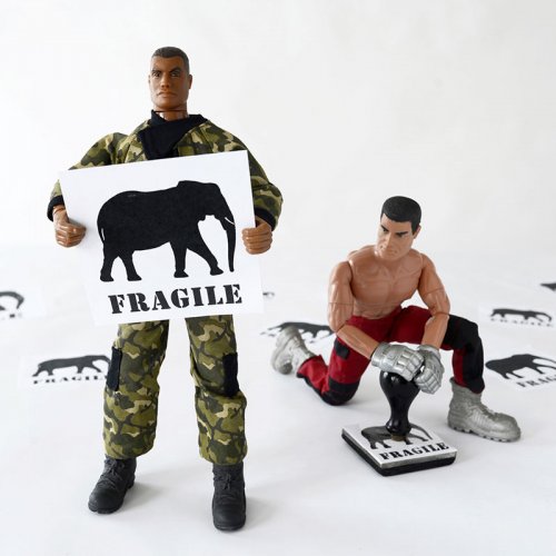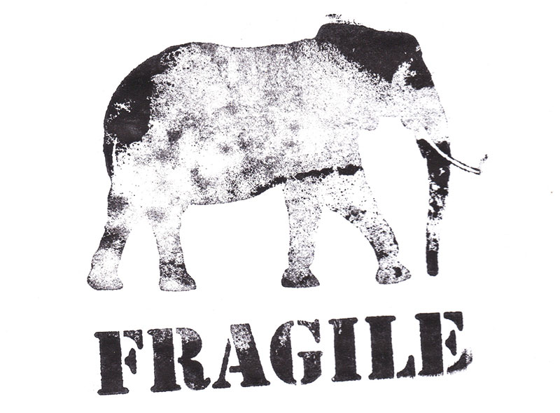 Elle imagine pour le réaliser un tampon où l’on peut lire FRAGILE sous l’idéogramme d’un éléphant. Antonyme qui inscrit la fragilité de ce mastodonte face à un prédateur tel que l’homme et dont la disparition tire une fois de plus, la sonnette d’alarme en regard de notre incapacité collective à préserver notre écosystème et à agir alors qu’il est déjà presque trop tard.