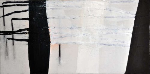 Mais il se trouve que Wolfgang Seierl ne les fait pas apparaître sur le devant de la toile. Ces mots semblent à la fois recouverts d’une couche claire translucide puis de couleurs sombres souvent et de traits qui forment comme autant de tentatives de ratures d’une voix retenue au loin.