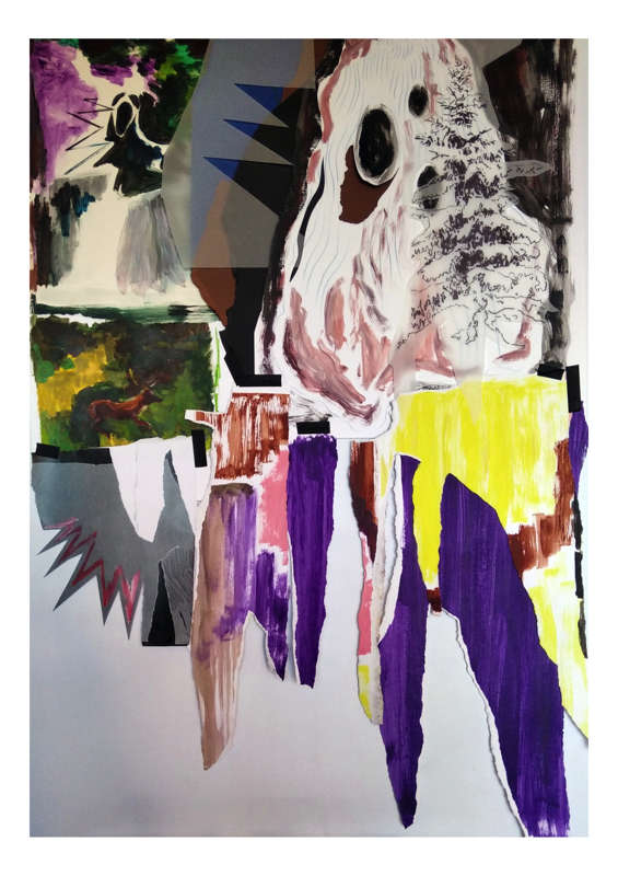 — Sur le papier tu utilises le collage, le crayon, la peinture : comment ces différents outils se combinent-ils ? Pour quelle raison utilises-tu l’un, puis l’autre ? Que cherches-tu ainsi à rendre ?
