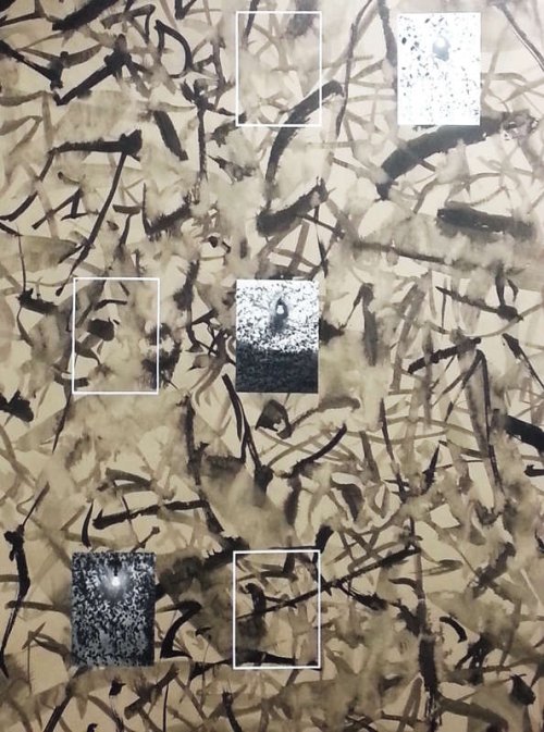 Photo (1977)/encre de Chine/Papier kraft, découpage/tissage/collage, 172 x 114 cm, 2019