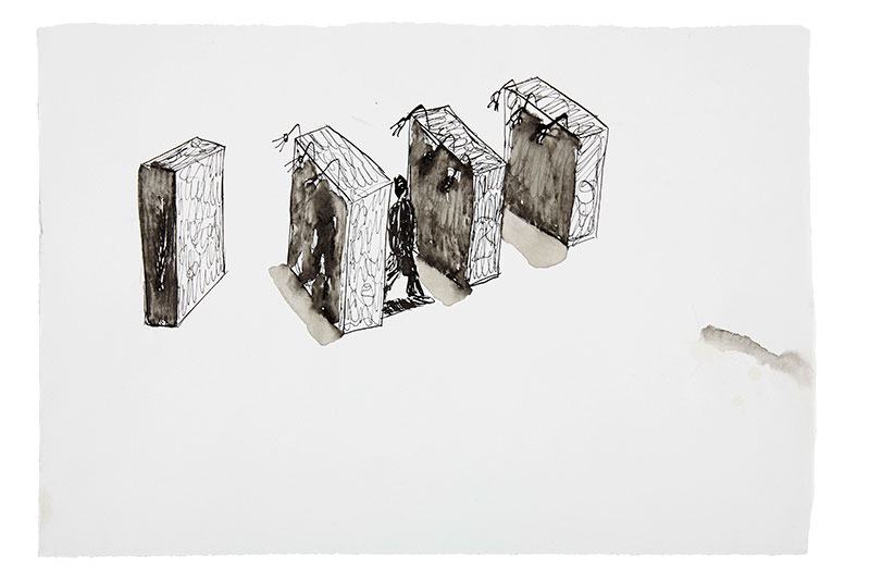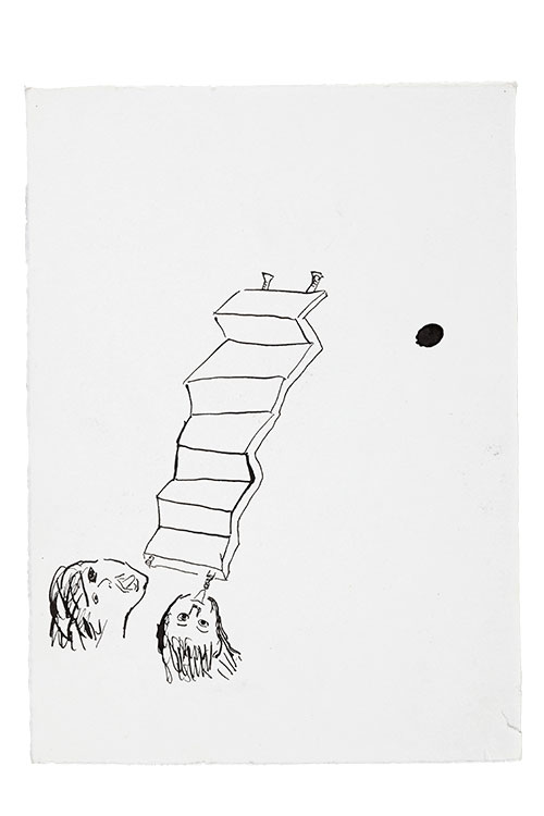 Et les dessins renforcent cette impression d’être face à un ensemble de propositions qui ont pour fonction de nous confronter à un certain malaise qui n’est pas celui de la civilisation que celui de ceux qui la vivent. Car ces dessins, eux vont plus avant dans l’énonciation de l’absurde, de l’impossible, du piège, de l’enfermement. Il disent l’absurde de l’être au monde, le piège qui se cache dans chaque situation, l’énormité de chaque situation qui, si elle n’est pas jouée et transformée en posture, en question, est transformée alors en prison. On le répète depuis des décennies, que la photographie est la technique qui permet de capturer des morceaux de réels. Ici ce sont les postures qui capturent l’image. Car quelque chose de plus que ce qui est montré, et qui transforme le geste en posture, vient se glisser en permanence dans ces images. Ce quelque chose n’est pas leur signification au sens où elle serait immédiatement donnée, mais la fonction si l’on peut dire « remplie » par une certaine vacuité, celle qui se loge dans l’évidence même de ce qui est montré.