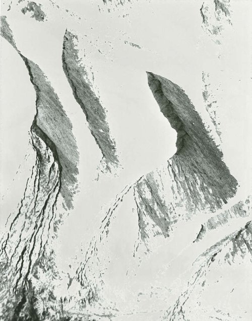 Ainsi, il n’est pas étonnant que poussant jusqu’à ses limites pratiques son approche plasticienne de la photographie, dans un oubli radical de toute idée de représentation saisie par un négatif et uniquement sensible à des tonalités de gris, de brun, elle se soit lancée dans des oeuvres qui, par le même jeu de cache radicalisé, ont rendu manifeste sur l’image des ligens croisées, entrecroisées, un peu à la manière dont on représente l’adn.