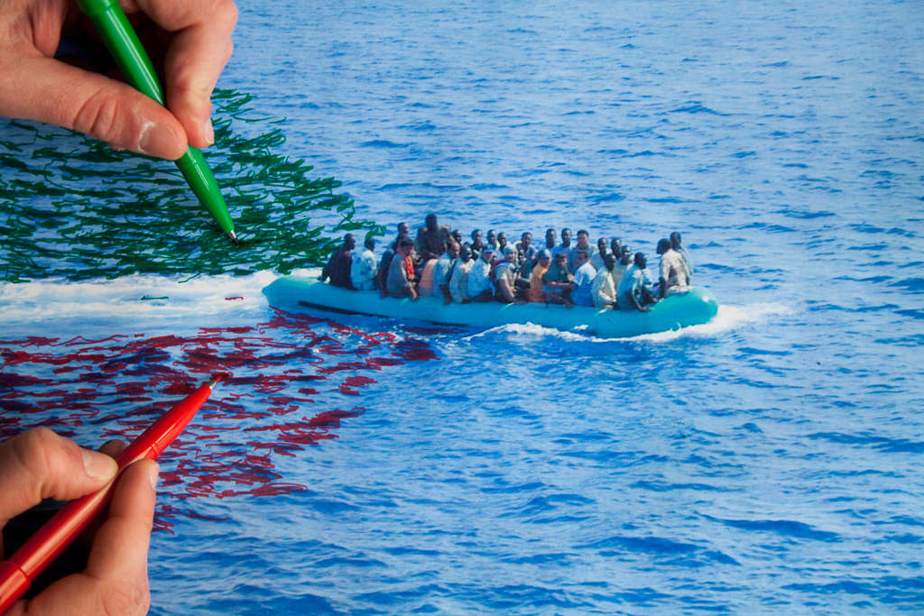 La scia tricolore al seguito del gommone si offre alla lettura con disarmante semplicità, suggerendo la meta del viaggio, didascalicamente indicata nel titolo.