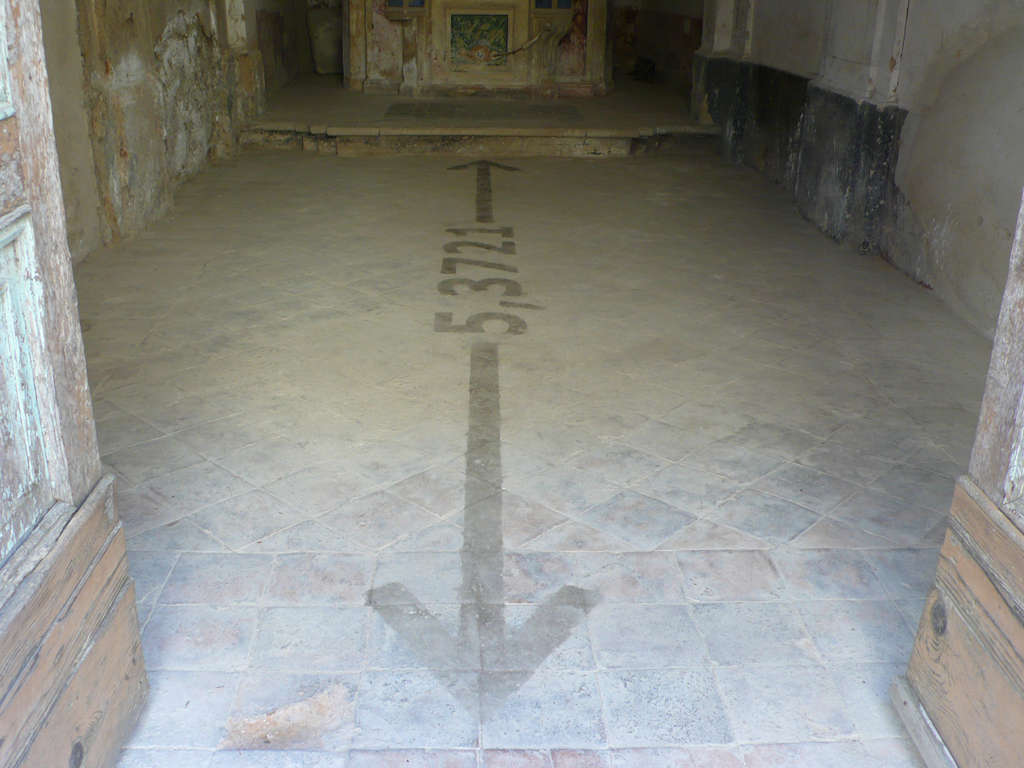 Il lavoro riporta sul pavimento la distanza tra l’ingresso e l’altare della cappella tracciata con la polvere, come simbolo e testimonianza del passato. Tale misura, da un lato rappresenta metafisicamente la distanza tra il mondo esterno e quello spirituale, e dall’altro -attraverso le quattro cifre dopo la virgola- suggerisce una percezione dello spazio che tende all’infinitamente piccolo, adombrando quasi un riferimento alle indagini scientifiche. Il titolo, infine, ideato parafrasando le parole che Dio rivolge ad Adamo nella Genesi scacciandolo dall’Eden (Polvere sei e polvere ritornerai), riconduce da una dimensione futura a quella presente, dalla proiezione spirituale all’immanenza della visione.