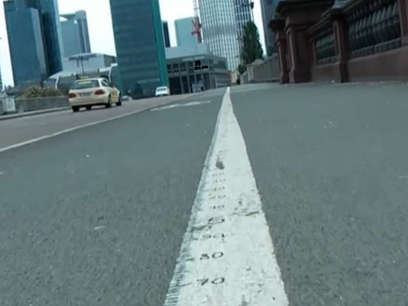 Una sorta di contraltare all’oggetto-metro può essere individuato nell’intervento pubblico e nel relativo video intitolati Main Bridge (2013), realizzati a Francoforte. In questo caso, l’artista ha apposto sulla linea di demarcazione della pista ciclabile una numerazione progressiva, rendendola simile ad un metro e creando quindi un inedito strumento di misurazione. La striscia bianca, che identifica il confine stabilito nello spazio cittadino per un luogo riservato (in questo caso alle biciclette) cambia la propria natura e assume un nuovo significato attraverso l’intervento creativo.