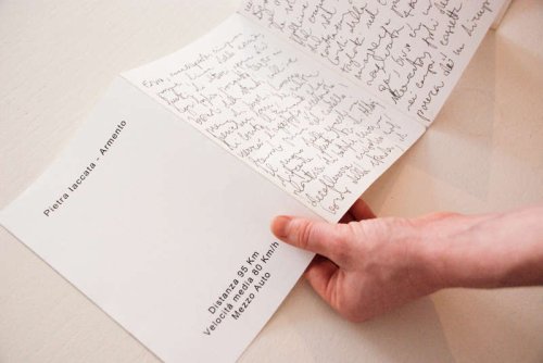 Il racconto che si fa mappa visuale è invece oggetto dell’installazione Paesaggio (2012) costituita dalla lunga sequenza di parole che descrivono, una dopo l′altra in maniera indistinta, tutte le cose osservate durante il viaggio tra Pietra Iaccata ed Armento (in Basilicata).