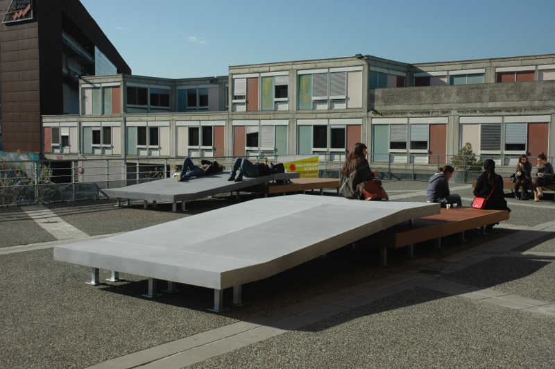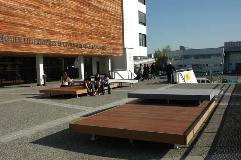 J’ai choisi d’intervenir sur le parvis en balcon. Potentiellement, cet espace conçu comme une dalle sèche exposée au vent, se présentant comme la proue d’un navire apparaissait comme un blanc sans qualité particulière. On voit bien sur l’image : un bâtiment de facture standard, un petit parvis qui s’avance en promontoire et sur lequel viennent se positionner les trois éléments conçus par mes soins. Plus précisément il s’agit trois volumes plans composés chacun de deux surfaces, l’une plate, l’autre brisée à deux reprises. On remarque aussi que les ouvrages sont en bois (du Massurunda) et en béton composite ; qualités peu discernables sur la photographie. Chaque volume est monté sur une structure en acier galvanisé que l’on le devine uniquement lorsque la hauteur de prise de vue est basse.
