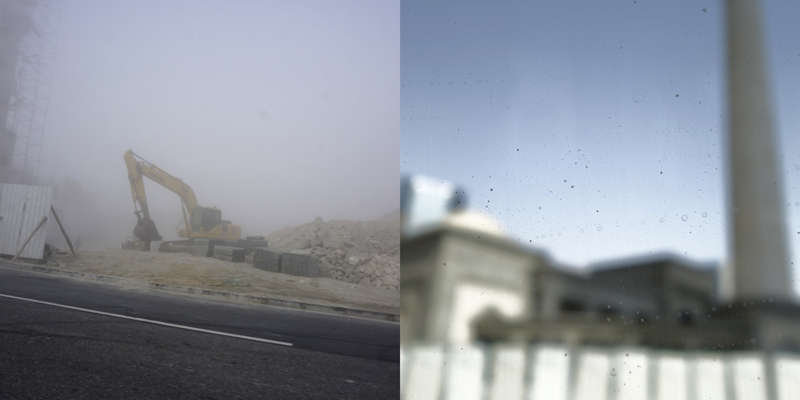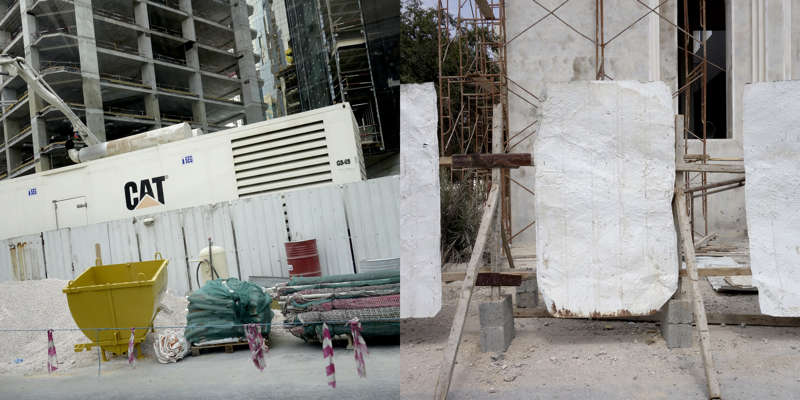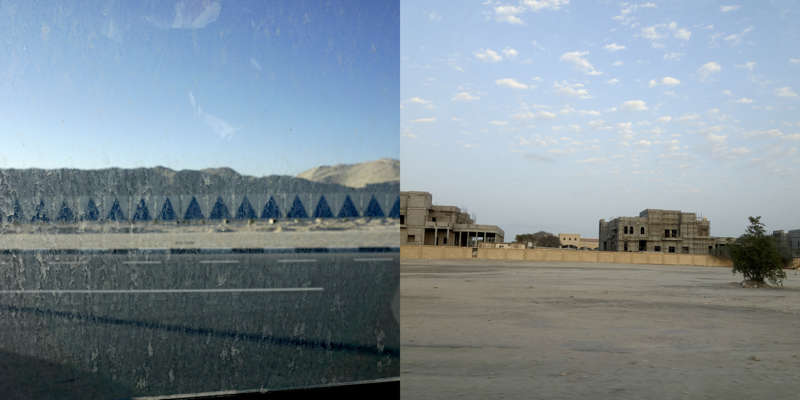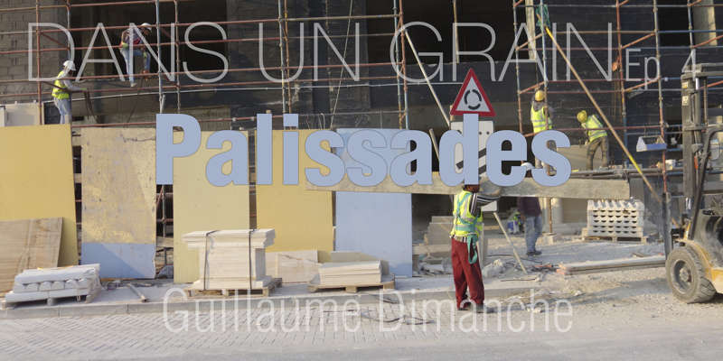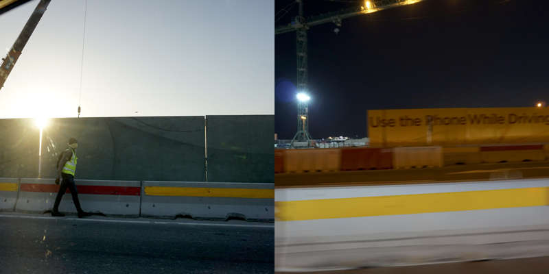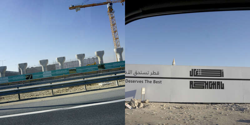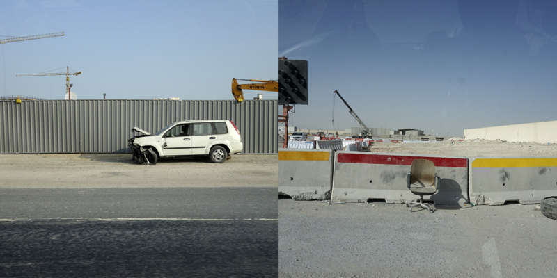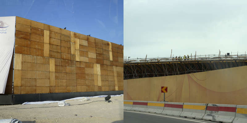 Vue de la route, le dessin d’un état se lit dans ses murs. Ceux du Qatar, pays en construction, sont en grande partie provisoires. Ce sont des palissades, des petites falaises qui empêchent les accès, les passages, préservent des regards. Toutes sont temporaires, elles ont déjà disparu, ont été installées sur un autre chantier, ou mises au rebut. Elles sont signifiantes aussi, comme un langage elles parlent, elles signifient, elles peuvent être un support publicitaire ou même un élément politique.