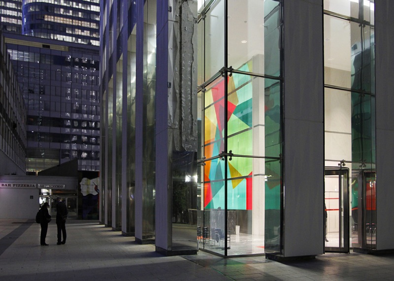 (Dé)construction colorée est à l’échelle d’un quartier comme celui de la Défense un geste symbolique. Le dessin de la tour, qui fonctionne a priori par succession de plans horizontaux, est ici renversé sur un axe vertical.